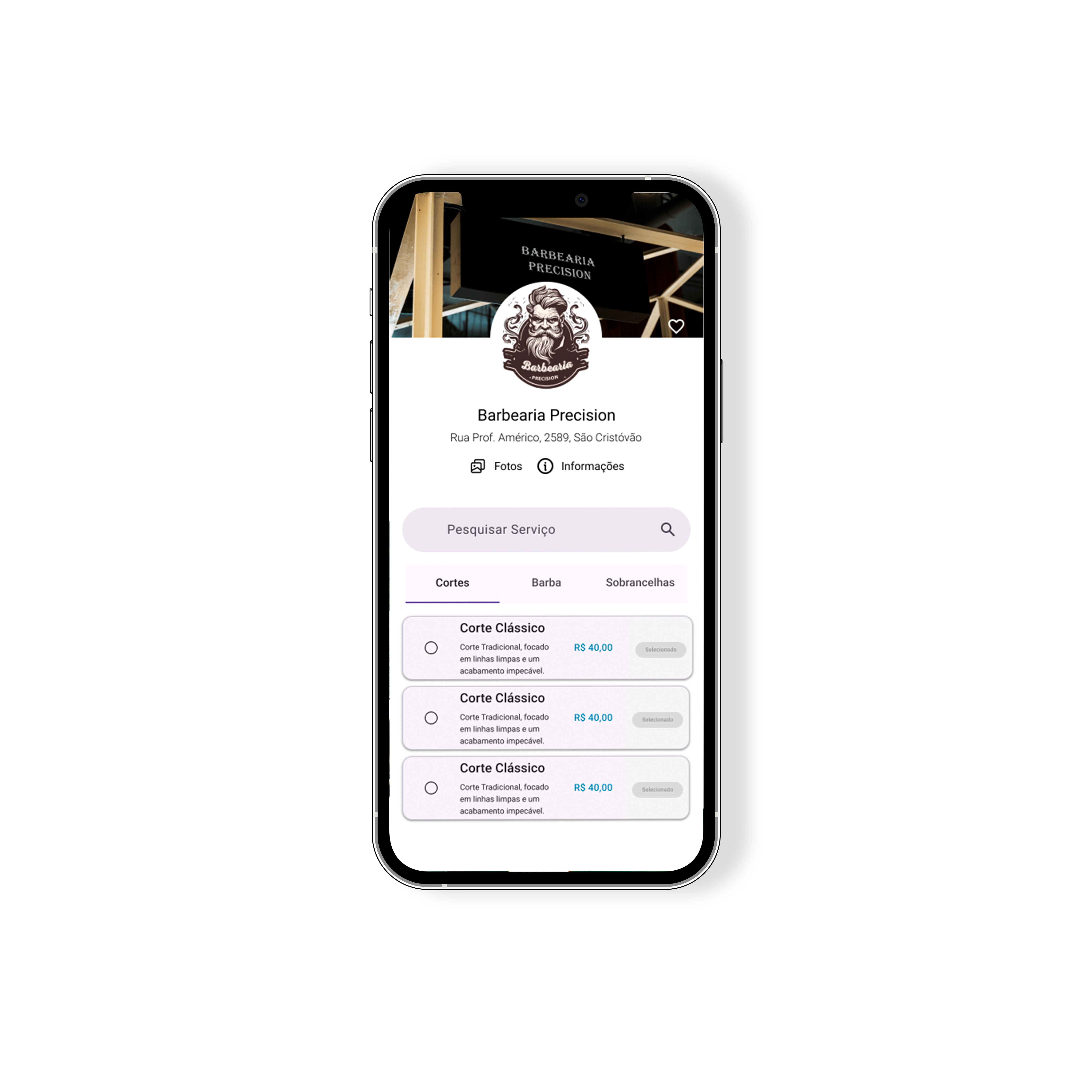 A interface apresenta aos usuários uma visão organizada, com fachada, logo, categorias de serviços, descrição dos serviços e preços. O fluxo de agendamento é direto, garantindo que o usuário esteja sempre atualizado sobre o status de suas ações. Ao desenvolver o design da interface, foram consideradas boas práticas de UX, com o objetivo de criar uma experiência de uso clara e intuitiva.